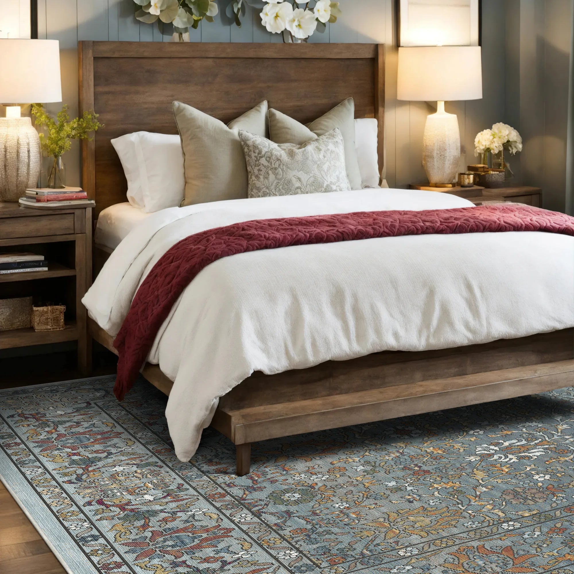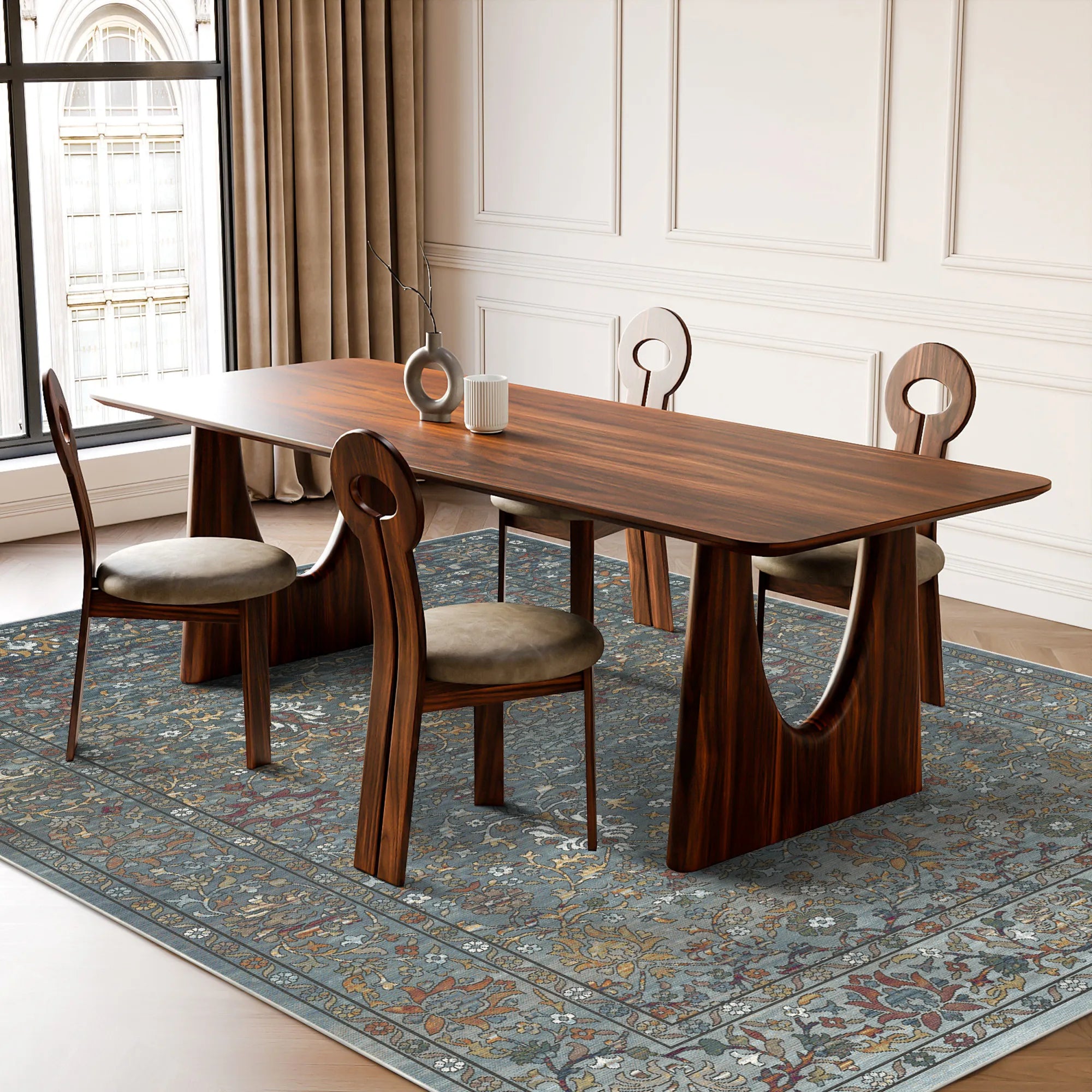 Сучасна розкіш переосмислюється свободою підтримувати доглянутий, високоякісний простір з абсолютною легкістю. Антикварний блакитний луг повністю можна прати в пральній машині, що дозволяє легко освіжити його туманні блакитні відтінки та складні текстури за допомогою простого циклу у вашій домашній пральній машині. Крім того, його елегантна та низькопрофільна конструкція спеціально оптимізована для роботизованих пилососів, що гарантує, що ваші автоматичні пилососи плавно ковзатимуть по вигадливих квіткових бордюрах без будь-яких перешкод. Це більше, ніж просто підлогове покриття; це міцний, функціональний витвір мистецтва, який запрошує позачасову пишноту та мирний сарафет стародавнього саду у ваше повсякденне життя, обіцяючи красиву та безстресову основу для вашого доглянутого дому.