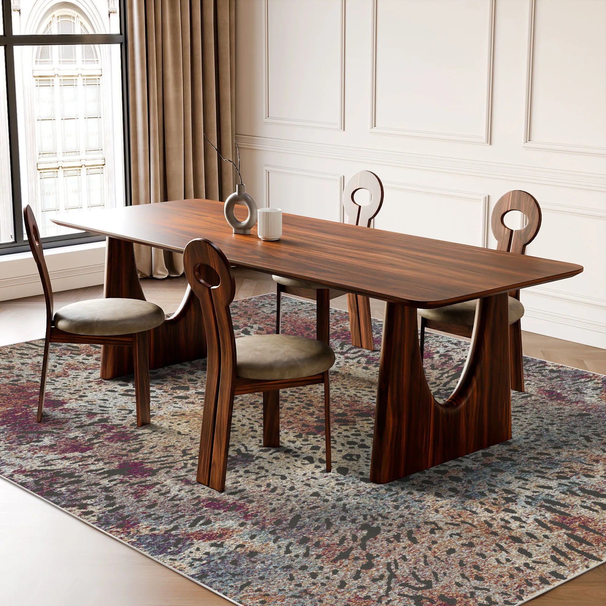 Привнесіть у свій дім первозданну красу природи та тепло традиційного мистецтва за допомогою цього приголомшливого покриття для підлоги. Дизайн вирізняється витонченою, абстрактною інтерпретацією диких леопардових плям, що поєднують землисті іржаві, бордові та вугільні тони на бежевій основі. Ретельно нанесене зістарене покриття надає килиму вінтажного, побутового характеру, що робить його ідеальним центральним елементом для богемних, еклектичних або сучасних сільських інтер'єрів.
