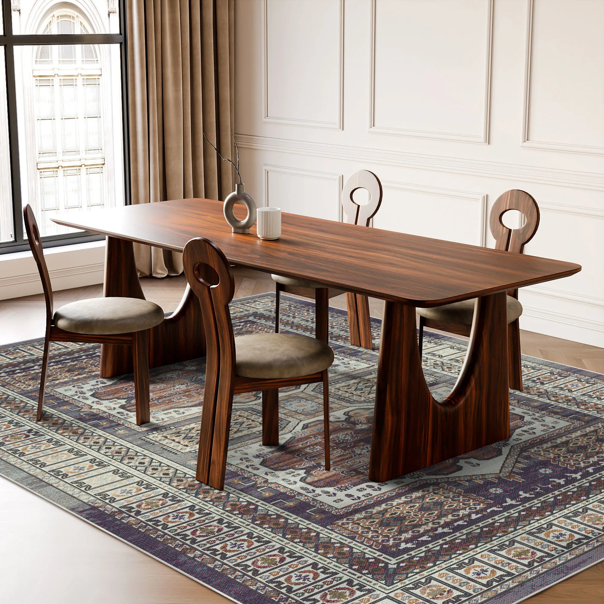 Пориньте у свій житловий простір у глибокий культурний резонанс та теплу, привабливу енергію килима з медальйоном з етнічного бурштину Самарканд, який можна прати . Цей шедевр є оспівуванням стародавнього текстильного мистецтва, знайденого вздовж легендарного Шовкового шляху, з чудовим медальйоном з подвійним вкладенням, який є символом архітектурного балансу та племінної спадщини. Дизайн представлений на тлі розкішного поля темно-сливового та витриманого теракотового відтінків, створюючи палітру, натхненну заходом сонця, яка випромінює комфорт та вишуканість. Витончені ботанічні сувої та геометричні візерунки «ключ» заповнюють численні прикордонні шари, обрамляючи центральні мотиви з тією ж точністю, що й вишукана кладка історичних пустельних цитаделей. Незалежно від того, чи він прикрашає душевну, еклектичну бібліотеку, додає шар тепла до мінімалістичної спальні чи служить грандіозним фокусом у традиційній їдальні, цей килим пропонує неперевершене поєднання історичної таємниці та сучасної елегантності.