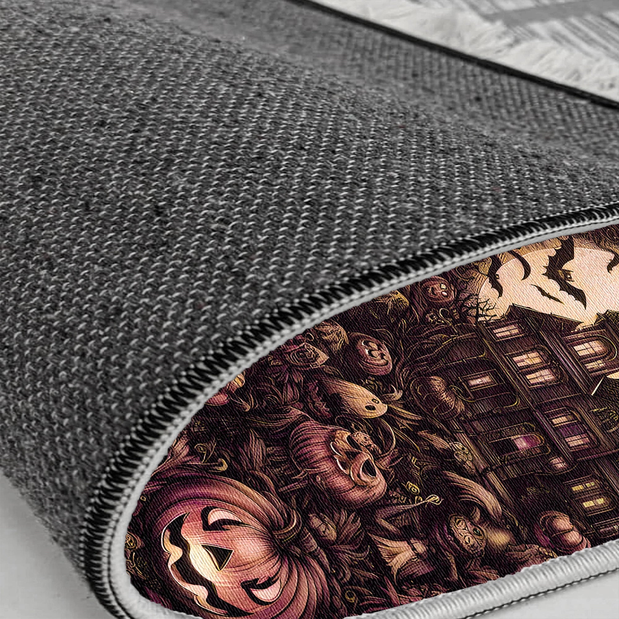 Створіть глибоку атмосферу та розкіш на Хелловін за допомогою цього вигадливого килимка на Хелловін з гарбузово-помаранчевим принтом . Дизайн – шедевр темного фентезійного мистецтва, що включає детально вирізьблений, моторошний особняк з привидами, залитий світлом блідого повного місяця та оточений роями кажанів. Усе поле заповнене десятками унікально вирізьблених, загрозливих гарбузів, фігурок скелетів та ледь помітних привидів, виконаних у насичених, похмурих тонах глибокого фіолетового, малинового та чорного кольорів.