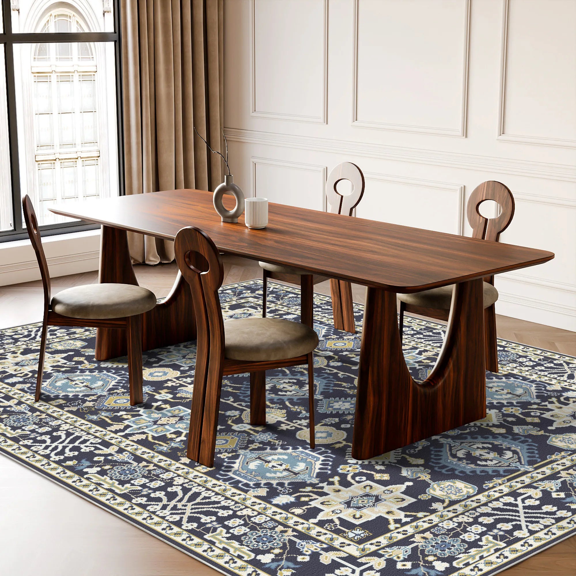 Відчуйте вершину сучасного та племінного поєднання з килимом Vortex Obsidian Zenith, що миється . Цей дизайн — вишукана візуальна симфонія з вертикальним розташуванням складних медальйонів, схожих на коштовні камені, які привертають погляд до його збалансованого центру, створюючи потужне відчуття фокусної енергії. Поле — це глибокий, атмосферний обсидіановий вугільний колір, що забезпечує висококонтрастну основу для високочітких мотивів, виконаних у матовому крижано-блакитному, м’якому шавлійному та античному кольорах слонової кістки. На відміну від традиційних блокових візерунків, модель Zenith демонструє геометричний ефект «розбитого скла», де кожен значок складається з сотень ніжних, взаємопов’язаних ліній. Обрамлений вражаючою багатошаровою облямівкою з ритмічними лозовими щитками та вишуканими кутовими прорізами, цей килим служить захоплюючим фокусним центром для авангардної вітальні, вишуканої домашньої бібліотеки або сучасної спальні, яка вимагає приземленої, але водночас художньої душі.