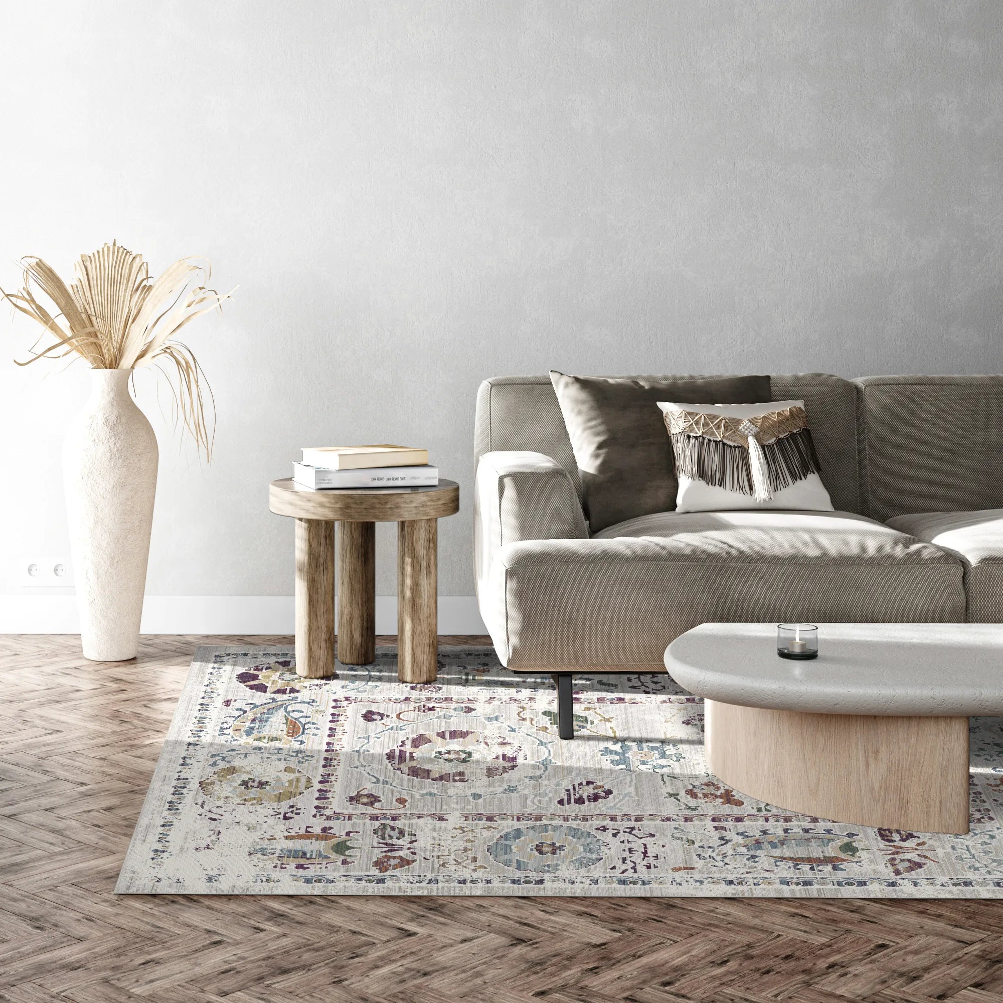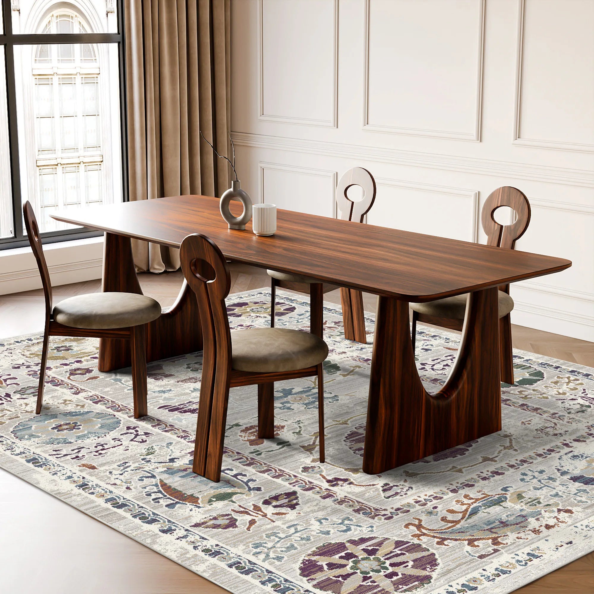 Вдихніть повітря поетичного спокою у свій дім з килимом Ethereal Flora Verse, який можна прати . Цей дизайн — витончене переосмислення екзотичних орієнталістських мотивів, що включає медальйони у вигляді примарних сонця та химерні акценти пейслі (буту), що пливуть по сяючому полю кольору слонової кістки. Палітра навмисно м’яка та повітряна, підкреслена вицвілими візерунками сливового, шавлійно-зеленого та приглушеного бірюзового кольорів, які виглядають як акварельні розводки на зістареному пергаменті. Зі своїми важкими горизонтальними смугами та навмисно стертими краями цей килим нагадує рідкісну ботанічну реліквію, знайдену у втраченому саду. Це неперевершений вибір для романтичної спальні в стилі шеббі-шик, світлої сонячної кімнати або сучасної мінімалістичної вітальні, якій потрібен нотка історичної душі.