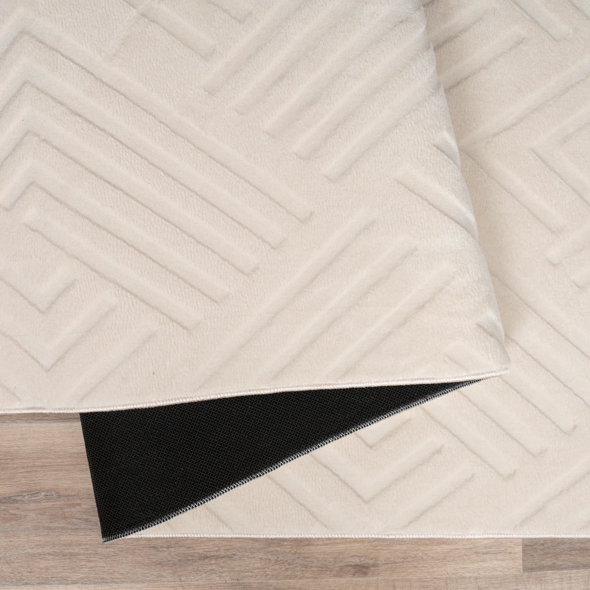 Освіжіть свій дім безтурботною елегантністю нашого килима "лабіринт" кольору слонової кістки. Чистий відтінок слонової кістки чудово підкреслює різьблений геометричний візерунок, створюючи насичену текстуру, яка надзвичайно м'яка на дотик. Цей килим додає спокою, лаконічності та сучасності будь-якій кімнаті, поєднуючи вишуканий дизайн з плюшевим повсякденним комфортом.