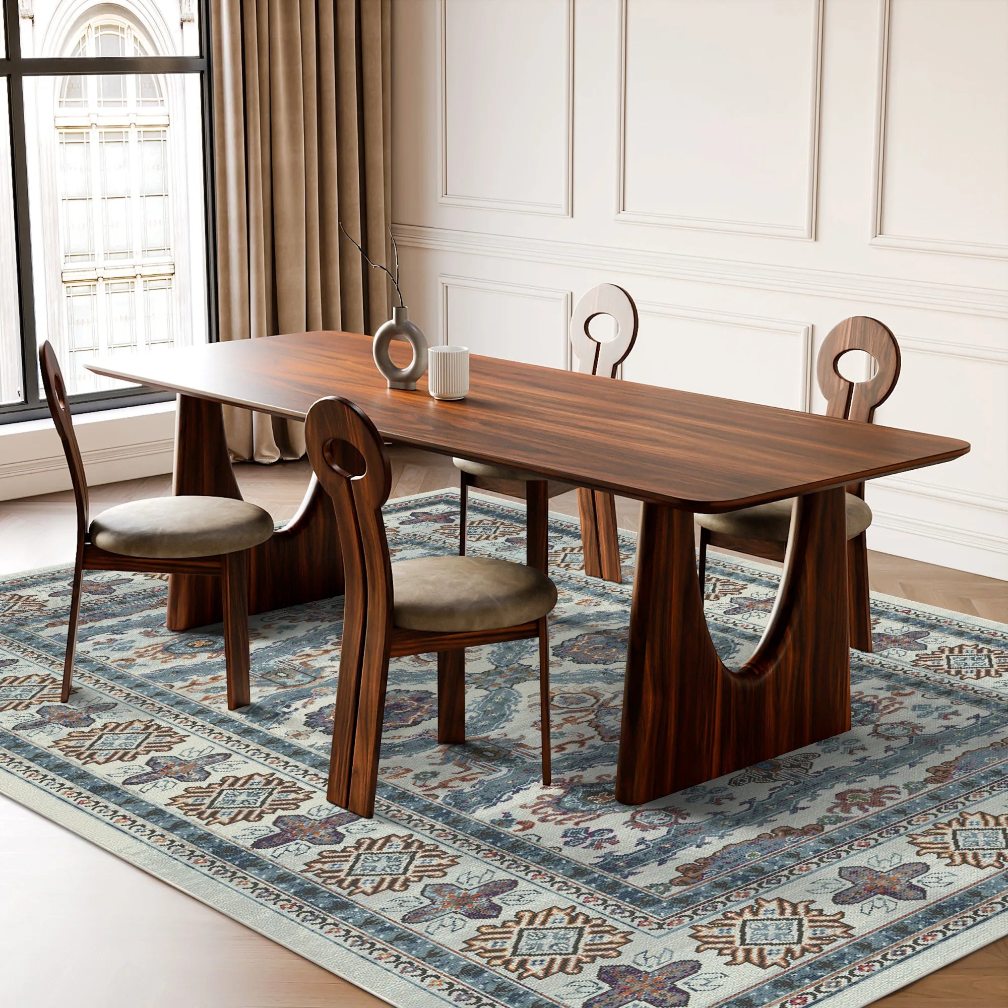 Відчуйте захоплююче поєднання давньої душі та сучасної сяйва з килимом Kashgar Aura Tribal Rosette, який можна прати . Цей дизайн є поетичною переосмисленням легендарного текстилю торгових шляхів, що включає ритмічний танець небесних мотивів «зіркового колеса» та стилізованих племінних розеток, які ніби ширяють у туманному, ефірному полі. Фон вирізняється унікальною текстурою з ефектом зістарення хвиль у відтінках туманної слонової кістки, срібного попелу та блідої блакиті, створюючи візуальну глибину, що імітує безтурботну поверхню гірського озера на світанку. Акцентовані приглушеними відблисками теракоти, охри та вугілля, складні орнаментальні бордюри килима обрамляють центральні візерунки з архітектурною точністю руки майстра. Це неперевершений вибір для світлої скандинавської вітальні, спокійної сучасної спальні або вишуканої головної спальні, яка прагне поєднати глобальну розповідь з легкою, повітряною енергією.