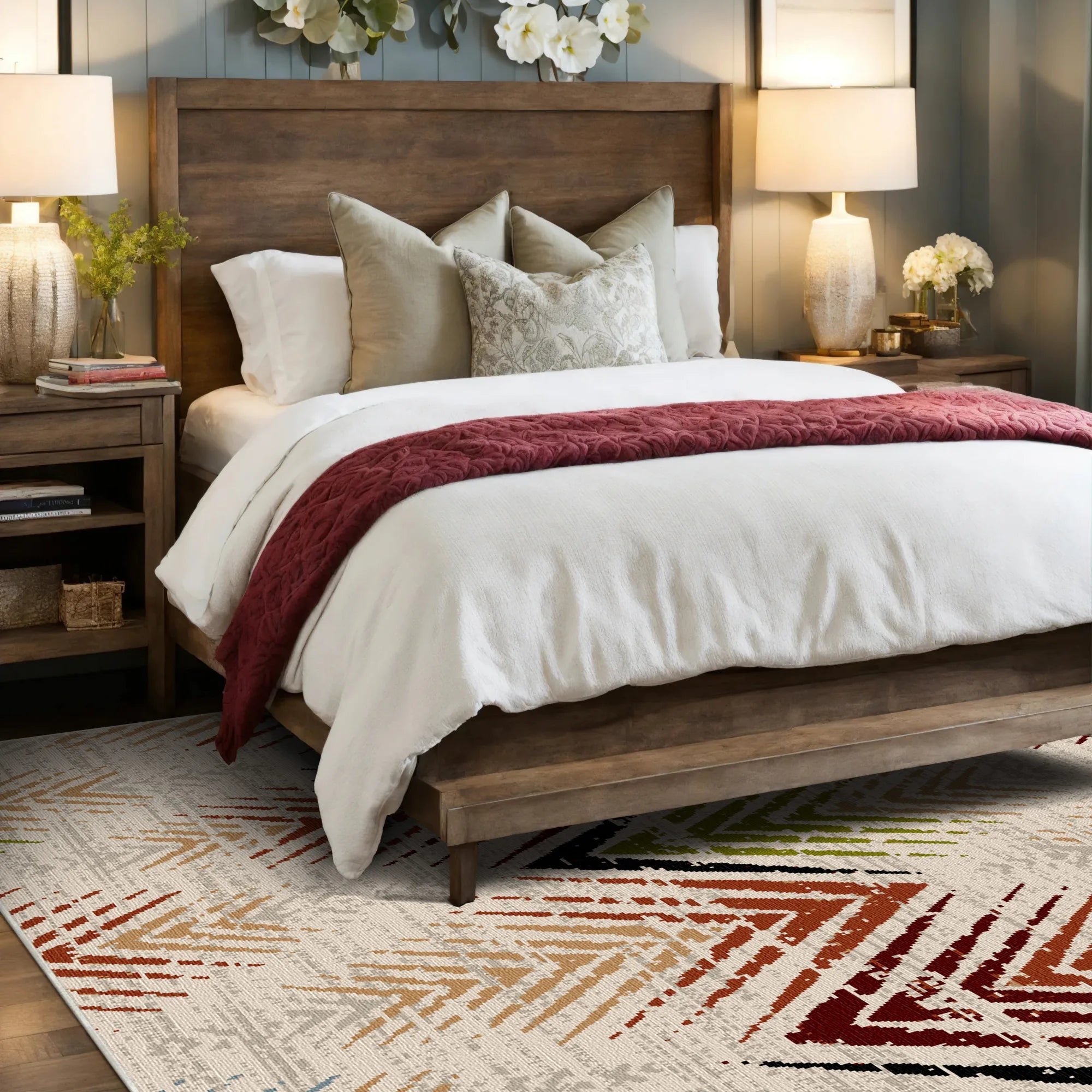 Наповніть свій дім яскравим ритмом килима Rio Mosaic Abstract, який можна прати . Ця жвава ітерація нашої абстрактної серії перетворює стилізований шевронний візерунок на фестиваль кольору, демонструючи сміливі штрихи іржаво-червоного, оливково-зеленого, небесно-блакитного та вугільного кольорів на теплому бежевому фоні. Потерта текстура додає відчуття ремісничої глибини, роблячи її динамічним фокусним елементом для богемних віталень, еклектичних обідніх зон або творчих студій, які шукають сплеск сучасної племінної енергії.