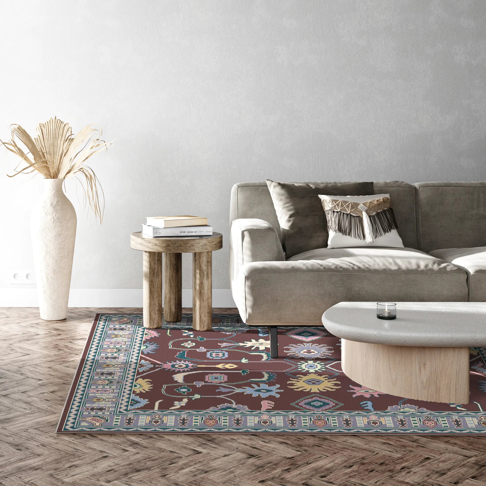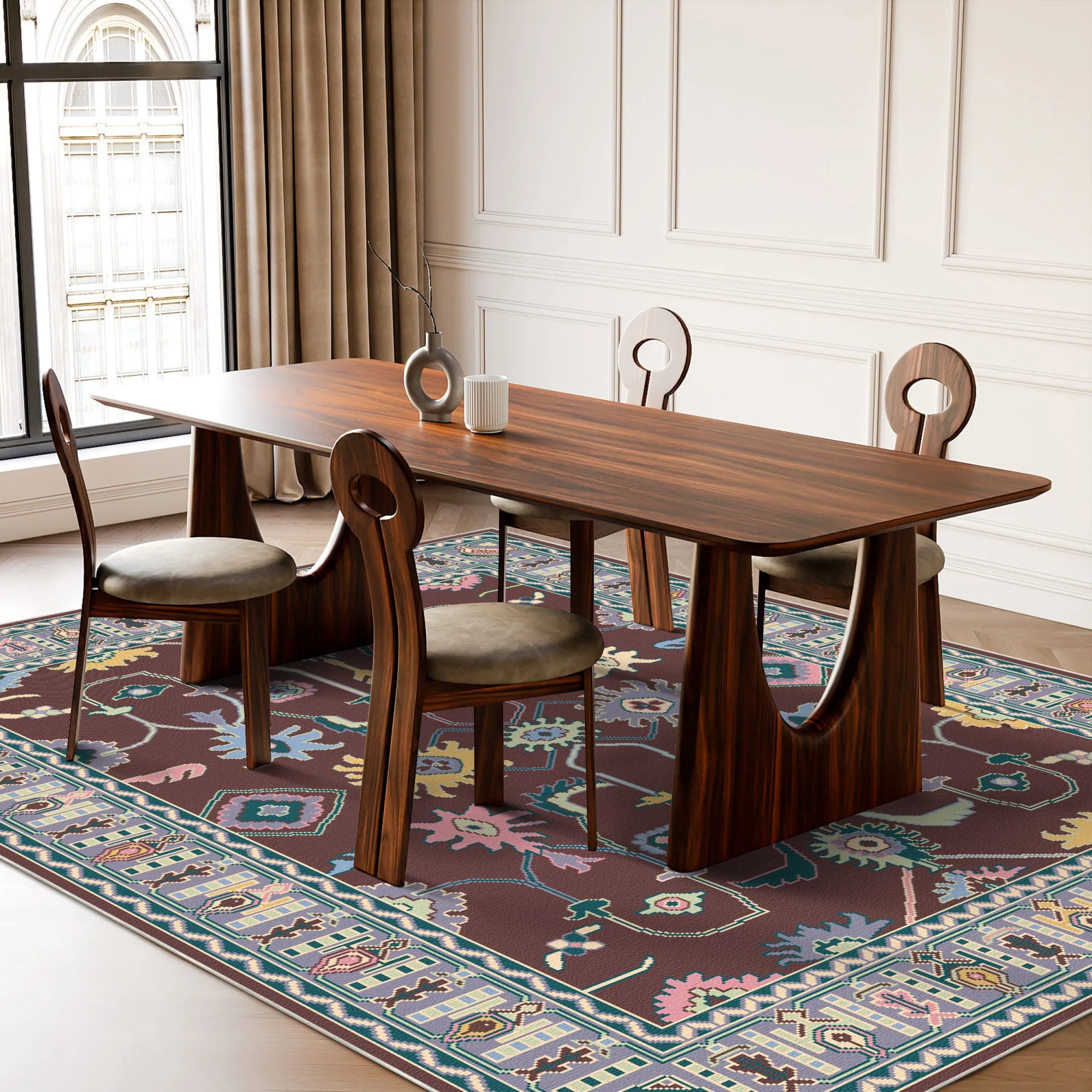Заземліть своє святилище душевною глибиною та ритмічною майстерністю килима Vortex Plum Mystic Totem, що прається . Цей дизайн – майстер-клас із симетричного оповідання, з центральною віссю, що тягнеться до ботанічних тотемів, та дзеркальними племінними емблемами, що викликають асоціації з тихою величчю опівнічного саду. Поле – це глибокий, оксамитовий сливовий еспресо, що забезпечує насичену та світлопоглинаючу основу, яка дозволяє високочітким мотивам небесно-блакитного, маслянистого жовтого та ніжно-рожевого кольорів виблискувати ніжним, люмінесцентним сяйвом. Кожен елемент, від стилізованих центральних квітів до ніжних звивистих лоз, ретельно збалансований, створюючи відчуття медитативного порядку. Обрамлений надзвичайно деталізованою багатошаровою облямівкою з ритмічними геометричними захисними елементами та м’якими лавандовими акцентами, цей килим – неперевершений вибір для затишного куточка для читання, вишуканої їдальні або основного гарнітура, який вимагає теплого, історичного відтінку з сучасним відтінком.