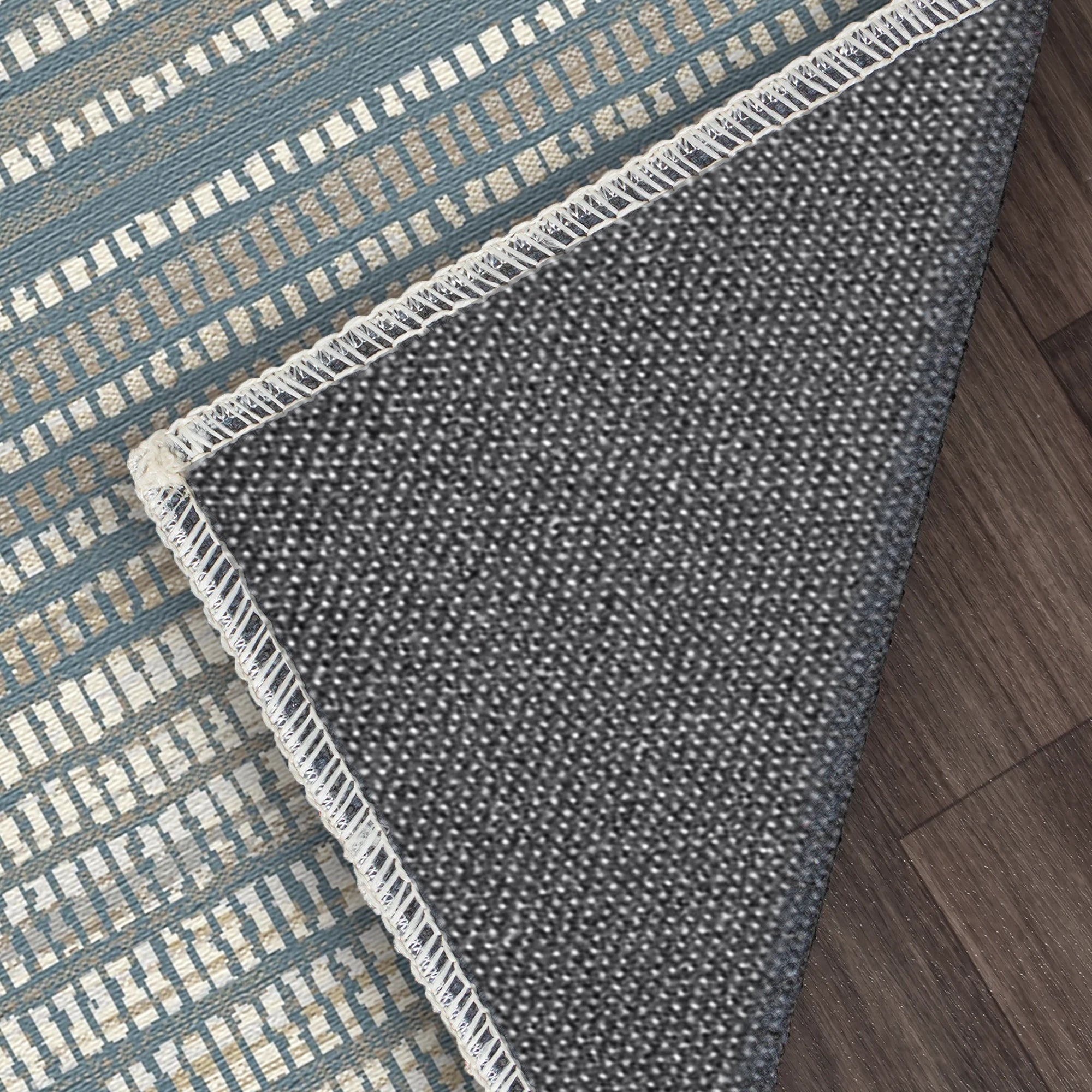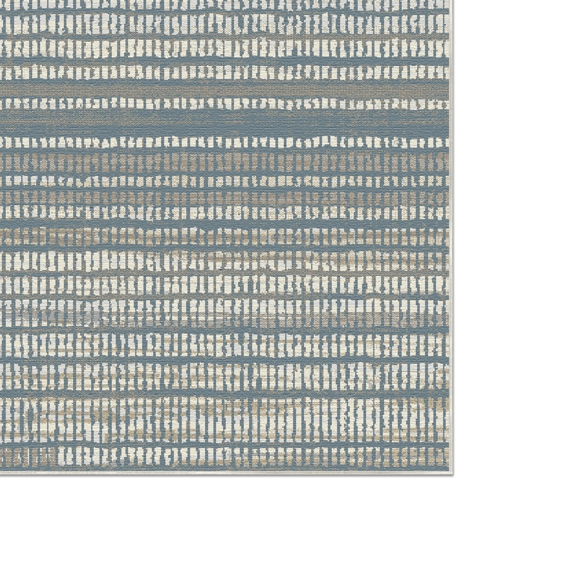 Майстерно розроблений для високих вимог, цей килим використовує найсучаснішу технологію цифрового друку , щоб відтворити його ніжні лінійні текстури та м'які градієнти блакитного кольору з високою чіткістю. Поверхня виготовлена з високоякісних поліефірних волокон , що забезпечує шовковисто-м'яку текстуру під ногами та матове покриття, яке чудово розсіює світло. Він має натуральну бавовняну основу , що забезпечує екологічну, повітропроникну та стабільну основу. Розроблений для практичності сучасного життя, цей килим повністю можна прати в пральній машині , що гарантує легкий догляд за його чистою та свіжою красою.
