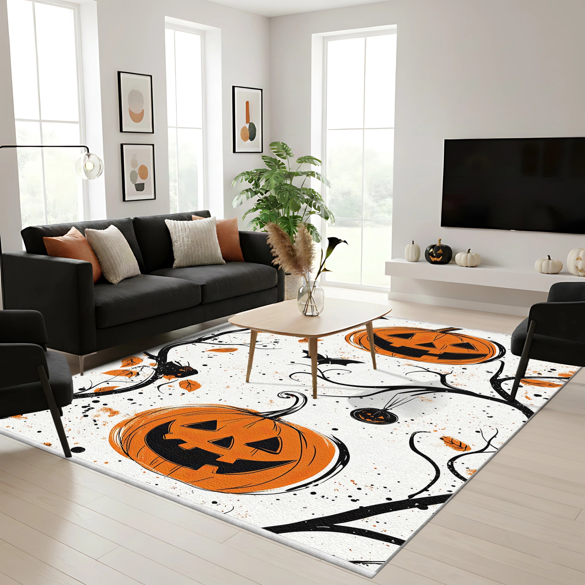 Додайте нотку художнього, сезонного шарму за допомогою цього мінімалістичного осіннього килима з гарбузом, який можна прати . У дизайні використовується свіжий, яскраво-білий фон, що створює висококонтрастне полотно для стилізованих чорних та помаранчевих елементів. Він містить великі ліхтарі з гарбуза в ескізному стилі, декоративні чорні гілки з падаючим помаранчевим листям та кажанів, що літають. Естетика ручного малювання та велика кількість білого простору надають цьому килиму чистого, сучасного, але водночас святкового вигляду, ідеального для тих, хто віддає перевагу менш традиційному темному декору на Хелловін.