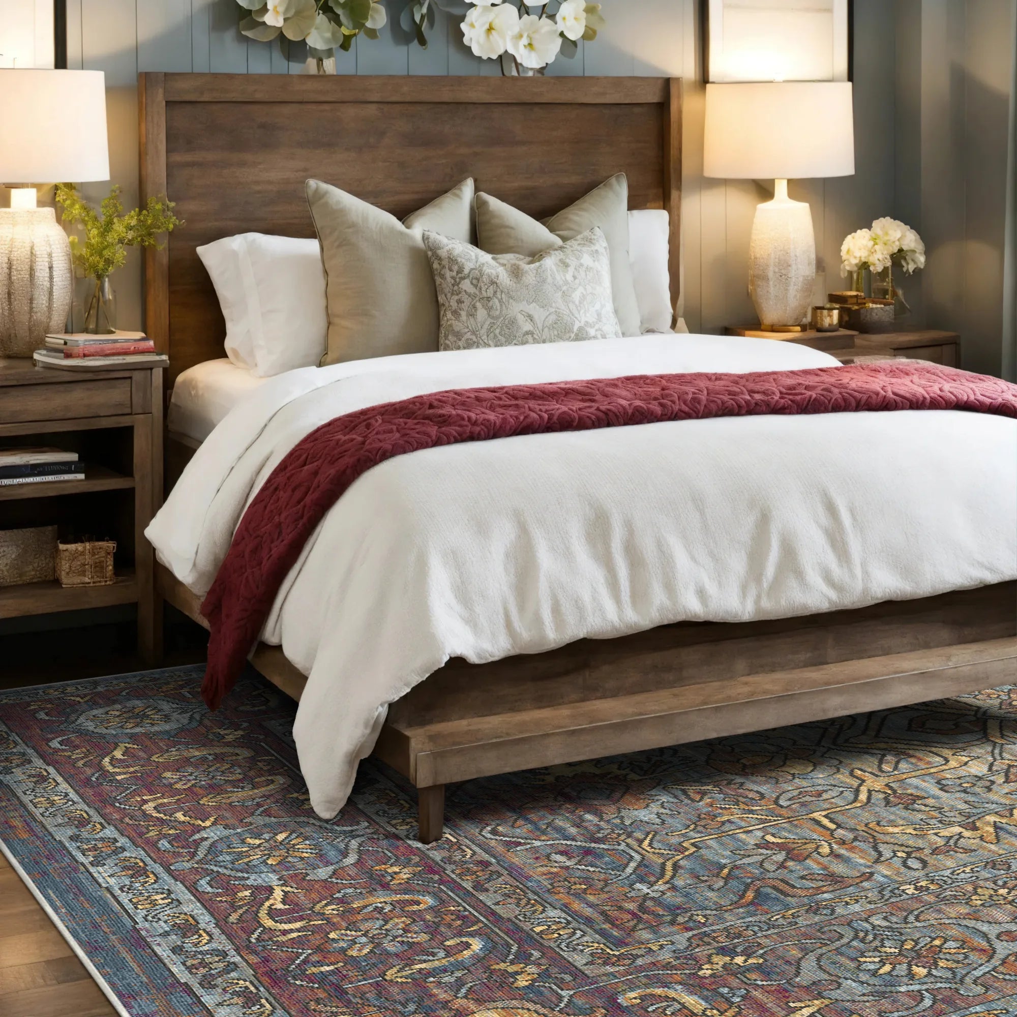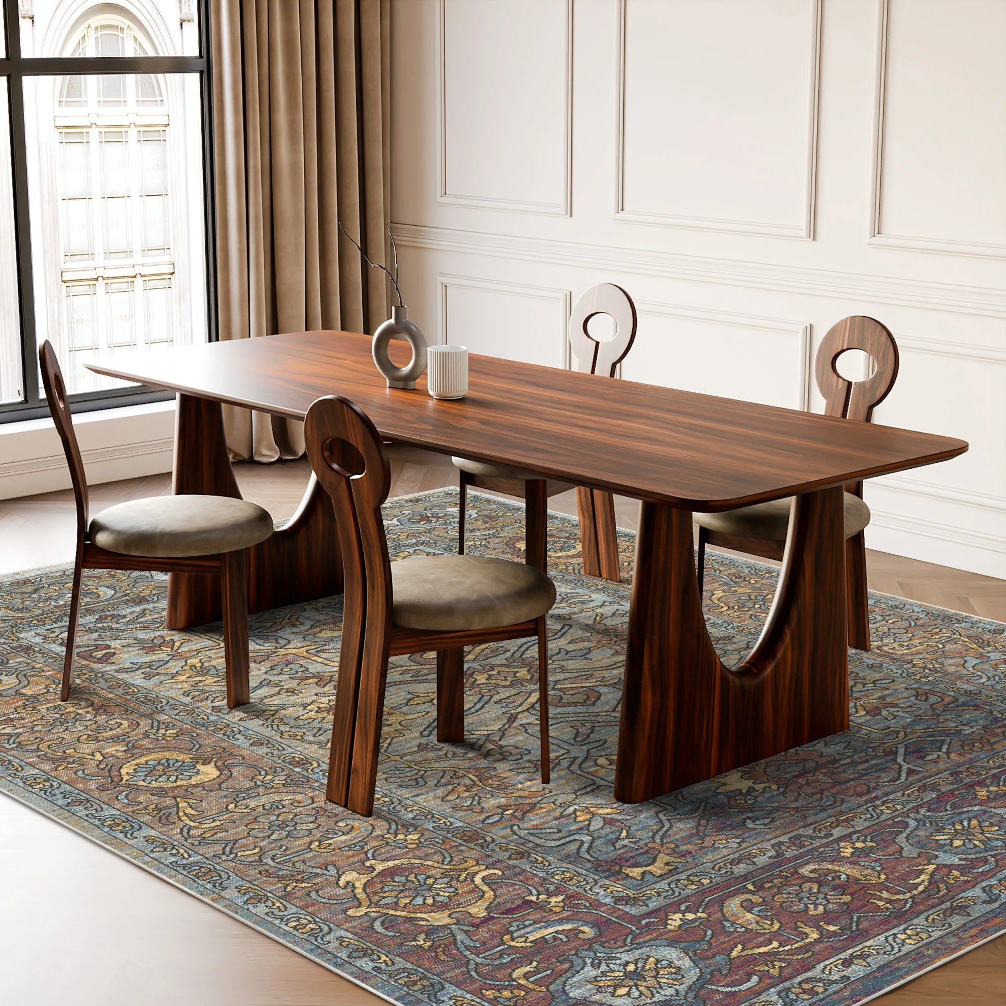 Пориньте у свій дім у легендарну елегантність Шовкового шляху з традиційним килимом Samarkand Blue, який можна прати . Натхненний величною плиткою та стародавніми садами Центральної Азії, цей дизайн є майстерним поєднанням класичного ботанічного мистецтва та сучасної естетики зістарених поверхонь. Килим має вишуканий мотив «Дерева життя», що розгалужується по сяючому відтінку сланцево-блакитного та вибіленого сонцем піску. Акценти глибокого бордово-гірчичного золота та сільської міді просвічують крізь вивітрену текстуру, створюючи багатошарову візуальну глибину, що нагадує безцінну антикварну реліквію. Це бездоганний вибір для вишуканої їдальні, спокійної головної спальні або доглянутого житлового простору, який прагне поєднати історичну велич зі спокійною сучасною душею.