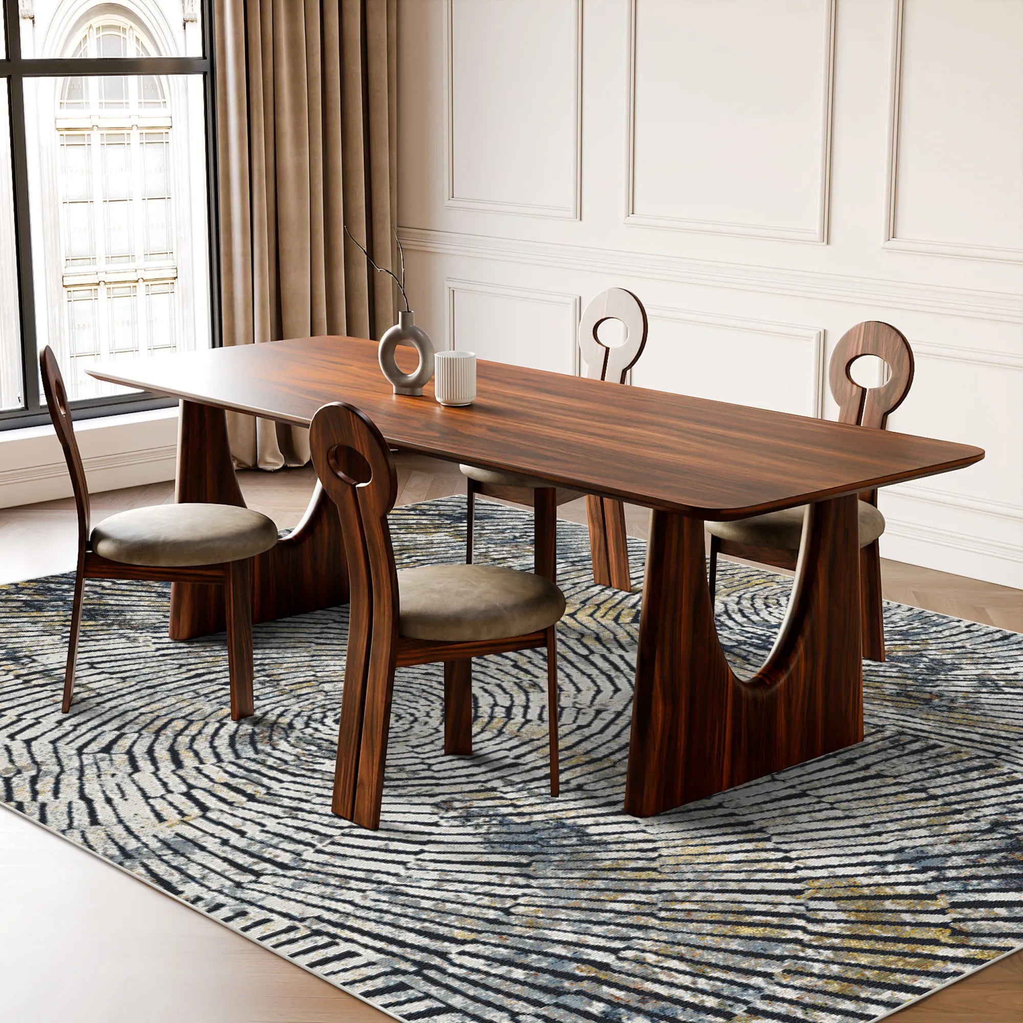 Хоча цей килим слугує приголомшливим витвором абстрактного мистецтва для вашої підлоги, він також створений для зручності повсякденного життя. Виготовлений з високоякісних, пружних поліефірних волокон, він пропонує міцну поверхню, яка витримує високий рівень навантаження, не вицвітаючи. Вбудована нековзка підкладка гарантує, що килим міцно закріпиться, забезпечуючи безпеку та стабільність. Ідеально підходить для сучасних домогосподарств, його можна прати в пральній машині для легкого очищення, а також він має низькопрофільну, плоску текстуру, яка дозволяє роботам-пилососам плавно переміщатися по ньому без перешкод.