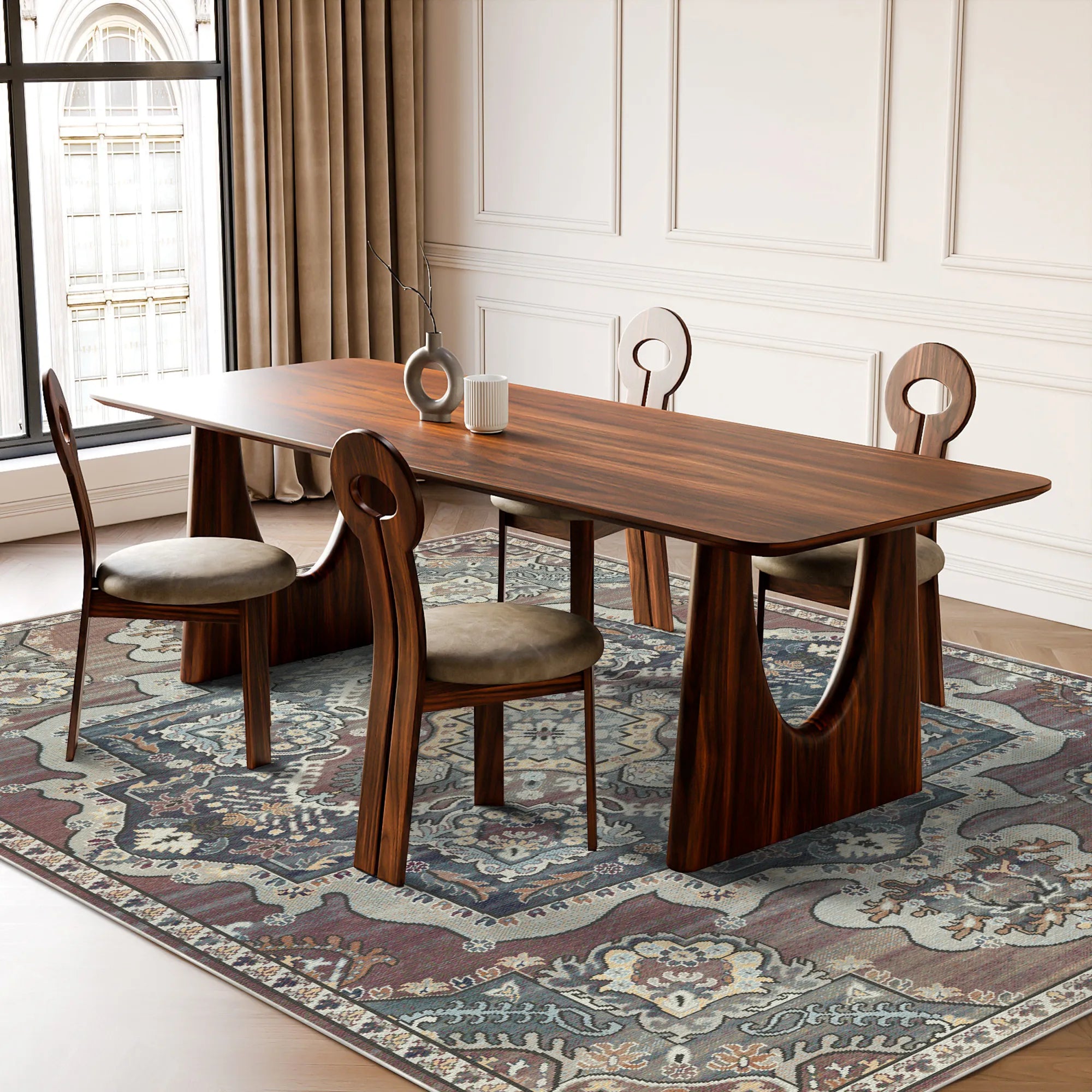 Піднесіть свій житловий простір до царства позачасової величі з килимом Sultanic Amber Royal Medallion, який можна прати . Цей дизайн є захоплюючою даниною золотому віку килимарства, вирізняючись просторим центральним медальйоном високої чіткості, який служить сяючим серцем кімнати. Поле купається в багатій, багатотональній палітрі кольору теракоти кольору заходу сонця, паленого бурштину та теплого сланцю, створюючи візуальну глибину, яка відчувається як рідкісний антикварний скарб, знайдений у сонячному внутрішньому дворику. Витончені, натхненні бароковим стилем переплетення та складний квітковий філігранний візерунок тягнуться з кутів, майстерно акцентовані медово-золотим, слоновою кісткою та м'яким сіро-коричневим кольором. Незалежно від того, чи хочете ви привнести нотку імперської історії в еклектичну вітальню, чи привнести відчуття королівського сарафету у вишукану обідню зону, цей килим пропонує неперевершене поєднання культурного резонансу та високоякісної естетики.