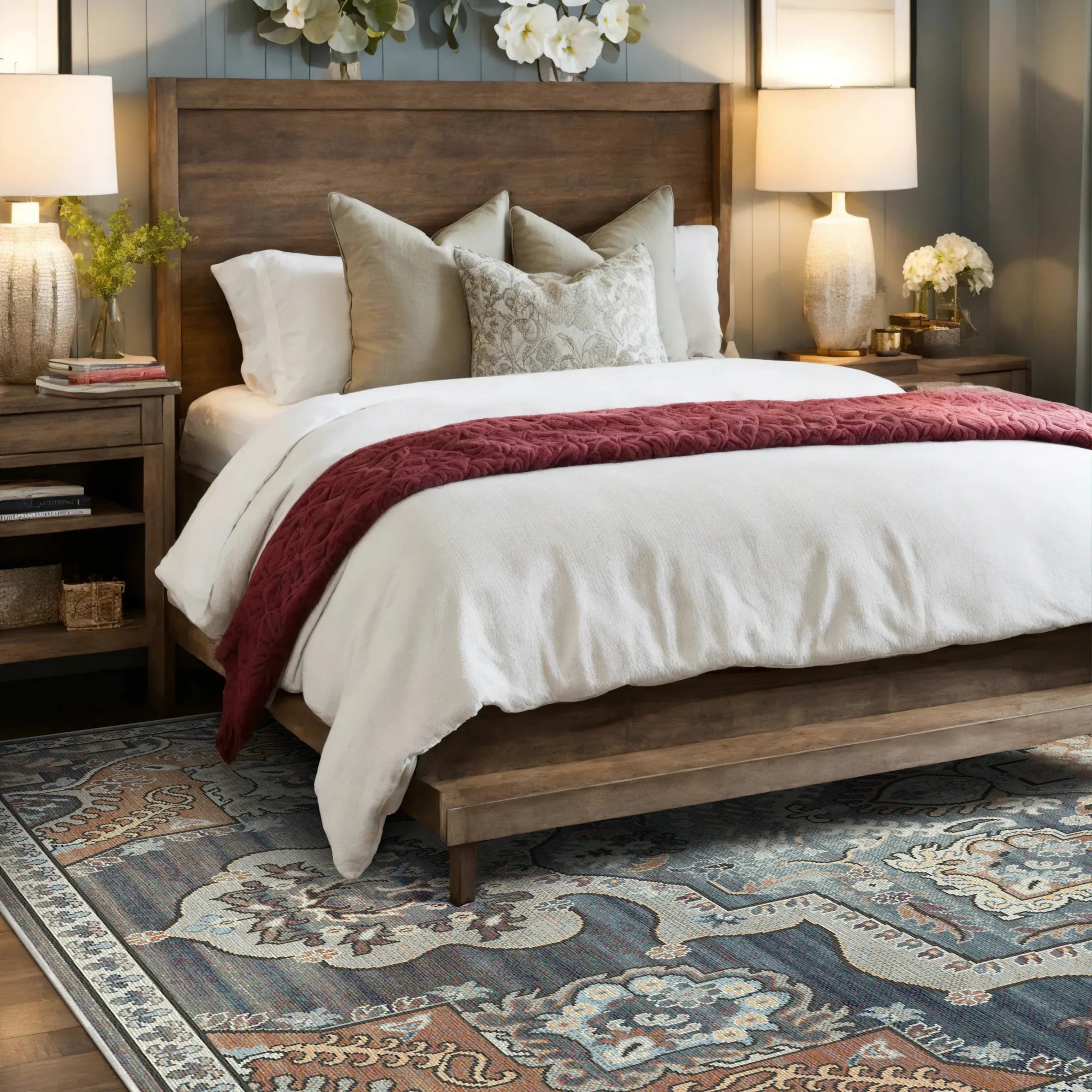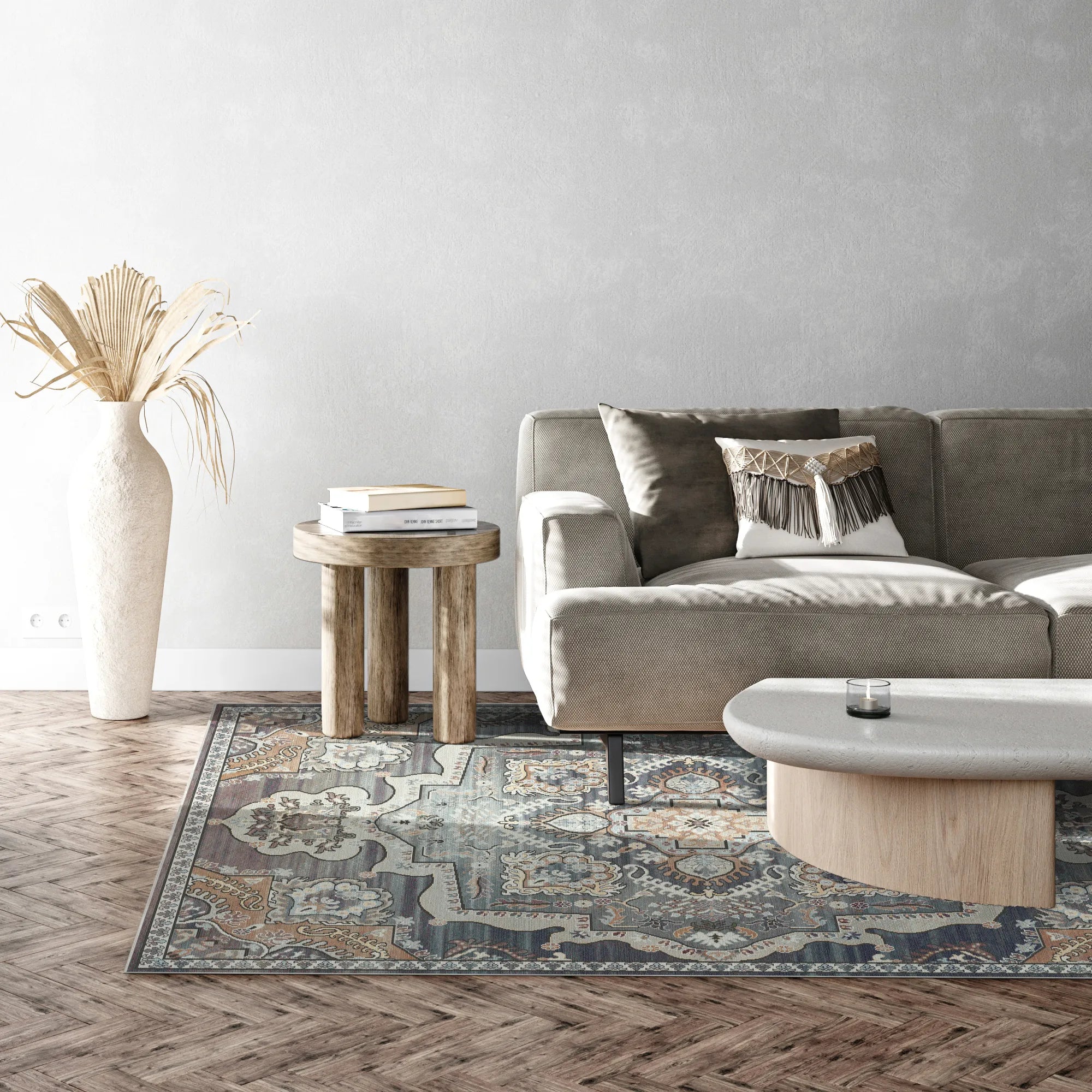 Приверніть увагу будь-якої кімнати захоплюючою симетрією та імператорською величчю килима Sultanic Azure Royal Medallion, який можна прати . Цей дизайн є вишуканою даниною легендарним «палацовим килимам» Сходу, з просторим центральним медальйоном високої чіткості, який діє як сяюче сонце у вашому житловому просторі. Цей шедевр оточений витонченими кутовими завитками в стилі бароко та квітковим філігранним візерунком, що контрастують з приголомшливим багатотоновим полем сталевого синього та сутінкового блакитного кольорів. Палітра майстерно збалансована з м’якими акцентами норки, медового золота та слонової кістки, створюючи відчуття історичної глибини, яке одночасно відчувається старовинним та освіжаюче сучасним. Незалежно від того, чи ви оформляєте величну офіційну їдальню, додаєте шарму престижу до головної спальні чи створюєте вишукану вітальню відкритого планування, цей килим служить потужним вираженням художнього стилю.