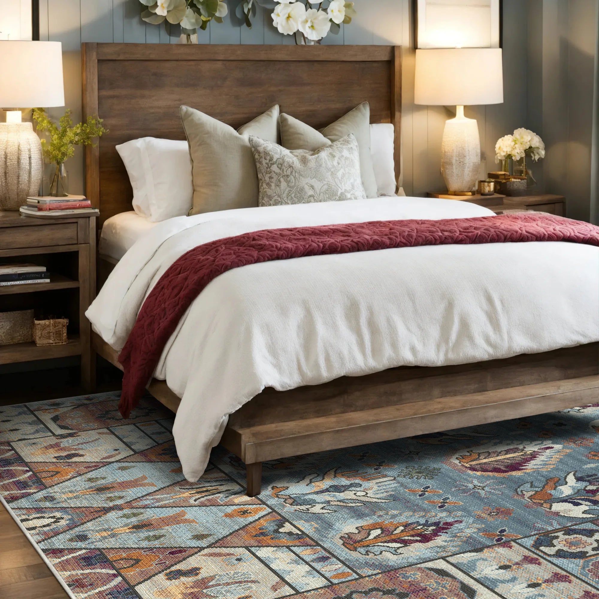 Відчуйте ідеальний баланс світлої ясності та культурної глибини з традиційним геометричним килимом Shirvan Azure, який можна прати . Натхненний багатовіковими ткацькими традиціями Кавказу та безтурботним світлом високогірних ландшафтів, цей дизайн вирізняється ритмічним полем стилізованих мотивів «дерева життя», розташованих у величній вертикальній послідовності. Легка палітра небесно-блакитного, туманно-сірого та сталевого блакитного кольорів майстерно акцентована теплим теракотовим, гірчично-золотим та м’яким кольором слонової кістки. Складні переплетені бордюри з ромбів та квіткових розеток створюють приголомшливий ефект «рамки», завдяки чому килим відчувається як рідкісний текстильний скарб, що з грацією постарів у сонячному святилищі. Це вишуканий вибір для світлої скандинавської вітальні, спокійної головної спальні або вишуканої сучасної обідньої зони, яка прагне поєднати традиційну авторитетність з легкою, повітряною енергією.