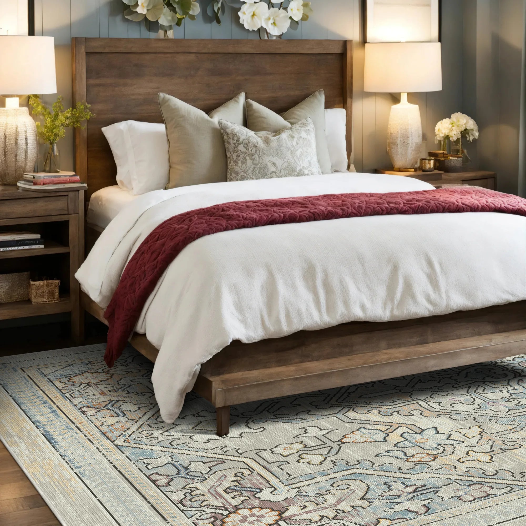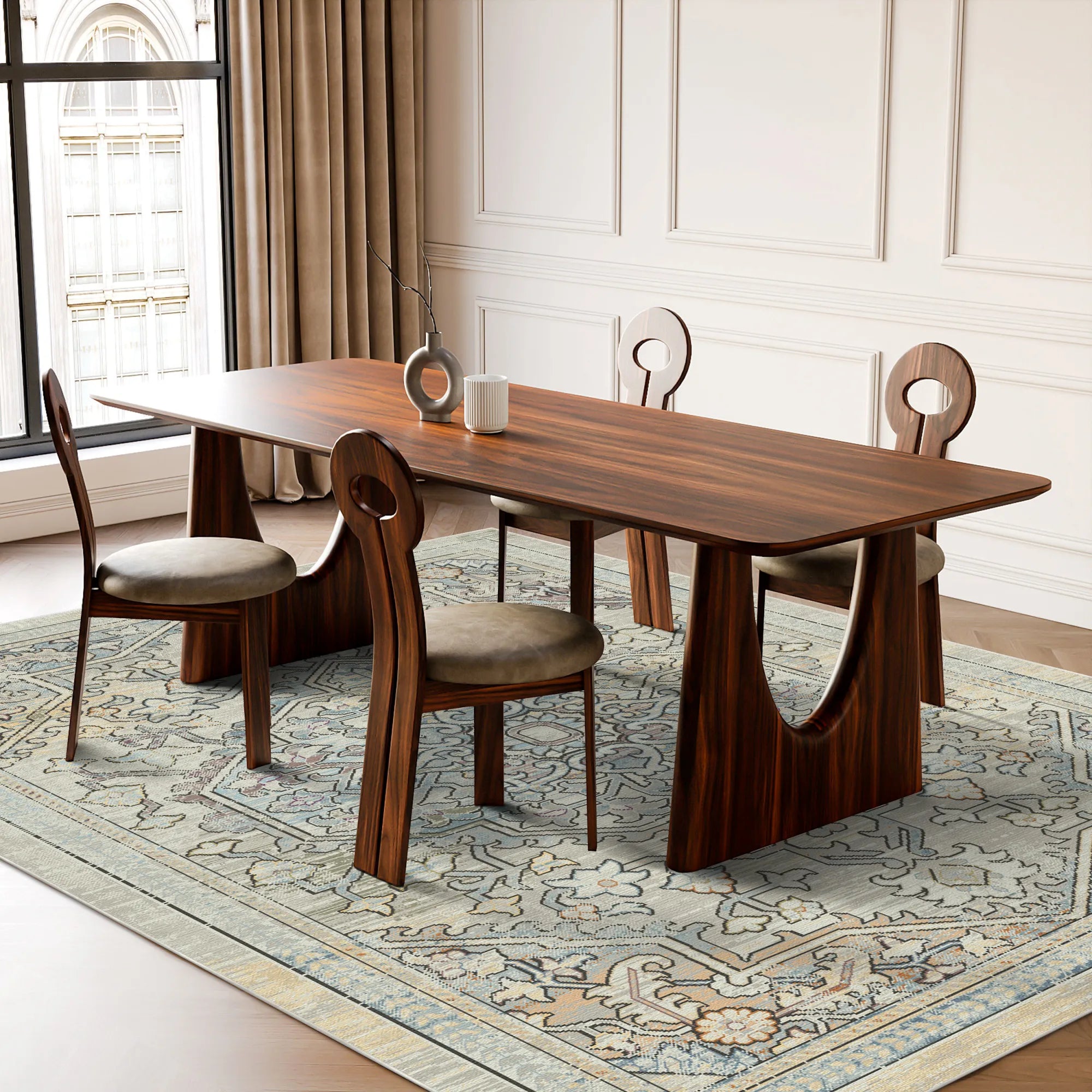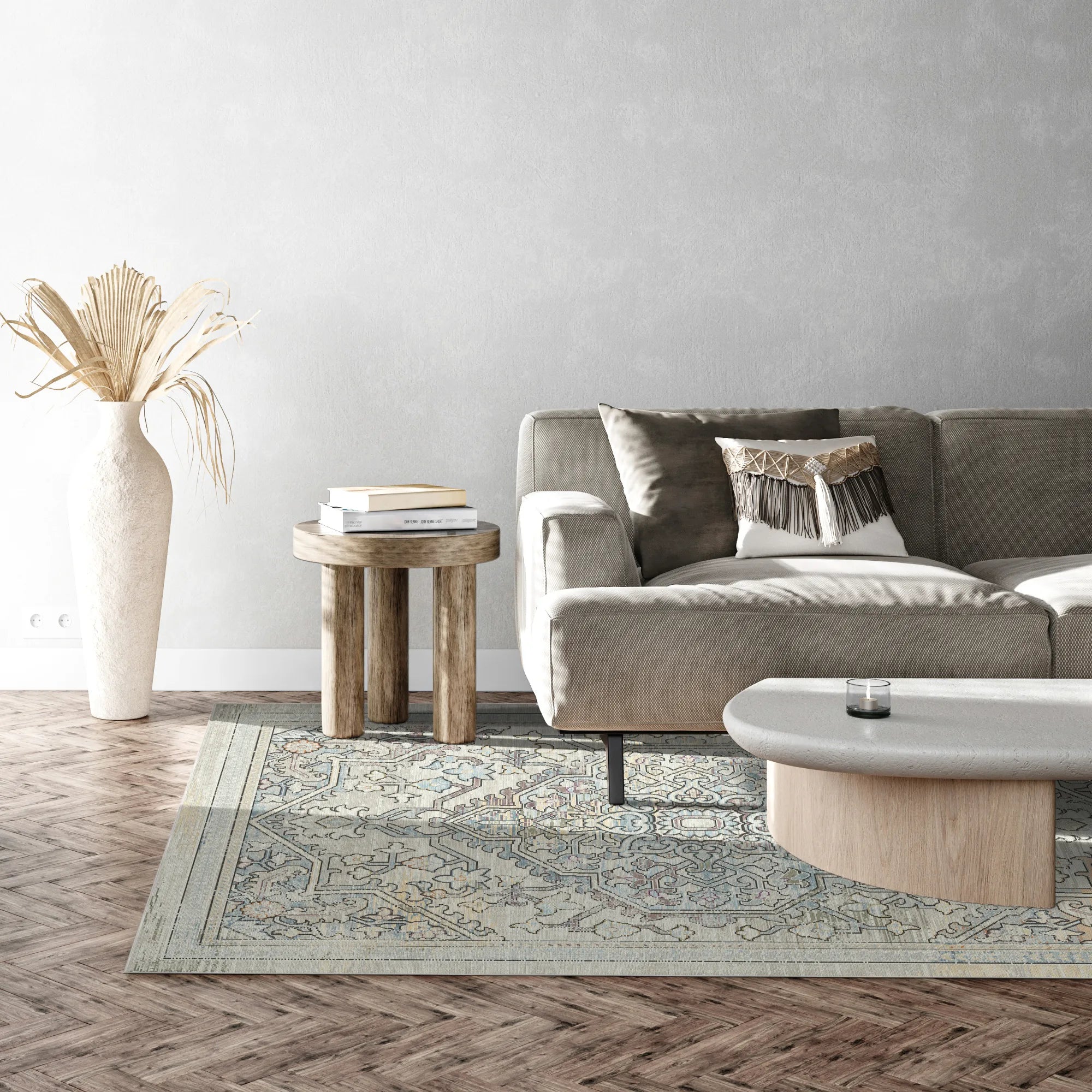 Пориньте у свою святиню в ефемерну красу та тихий престиж килима Vintage Sage Faded Medallion, який можна прати . Натхненний величними ботанічними гобеленами історичних маєтків та заспокійливими текстурами натурального каменю, цей дизайн вирізняється великим, витончено деталізованим центральним медальйоном, який ніби виринає з туману м'якого сірого. Вишукана палітра кольору запиленої шавлії, приглушеної норки та вицвілої блакиті майстерно вплетена з важким покриттям «під старовину», створюючи приголомшливу візуальну текстуру, яка одночасно відчувається старовинною та сучасною. Це неперевершений вибір для тихої скандинавської вітальні, спокійної головної спальні або світлої, просторої обідньої зони, яка прагне поєднати класичну авторитетність зі світлою та сучасною енергією.