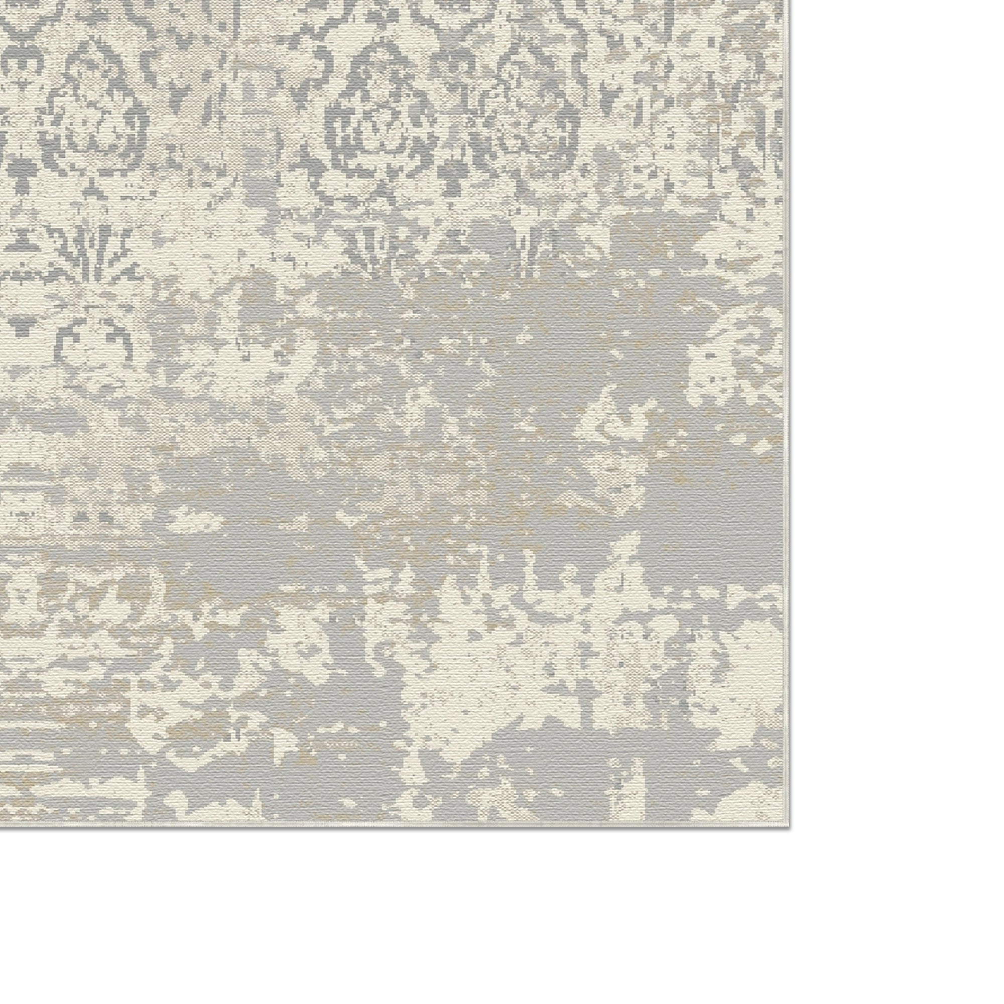 Вицвілий вінтажний дамаський килим з потертостями додає нотку позачасової елегантності та античного шарму будь-якому простору. Цей килим вирізняється класичним орнаментальним дамаським візерунком, включаючи центральний медальйон та складну облямівку, яка була сильно потерта, створюючи м'який, потертий та майже примарний вигляд. Приглушена кольорова палітра з м'якого сірого, світло-бежевого та кремового брудно-білого робить його універсальним предметом, який бездоганно поєднується з різноманітними стилями декору. Він ідеально підходить для додавання вишуканого стилю шеббі-шик до вітальні, спальні чи їдальні.
