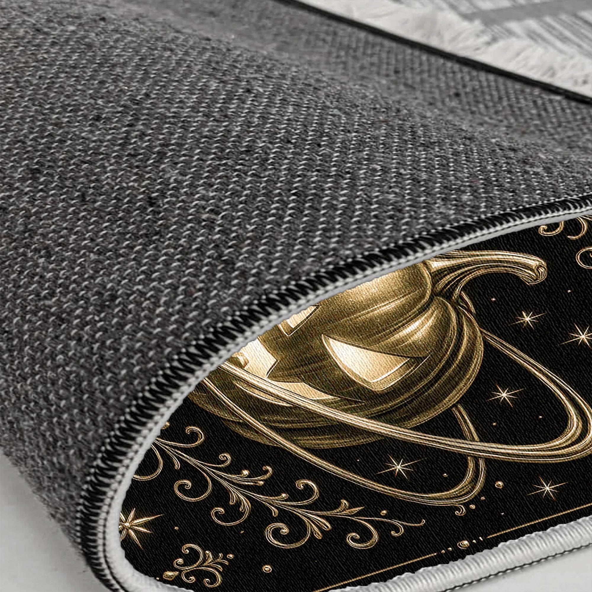 Підкресліть свій святковий декор цим справді розкішним та містичним килимом, ідеальним для вишуканої теми Хелловіну. Центральним елементом є захопливий різьблений гарбуз золотистого відтінку , драматично оточений космічними кільцями, схожими на сатурноподібні. На глибокому темному тлі дизайн обрамлений витонченим золотим орнаментом та блискучими зірками, що додає йому елегантності, готики та розкоші. Виготовлений з міцного поліестеру з м'яким ворсом висотою 8 мм , цей килим зручний та водночас міцний. Його стійкість забезпечується надійною бавовняною підкладкою , а його можливість прання гарантує, що його розкішний стиль залишатиметься легким у догляді сезон за сезоном.